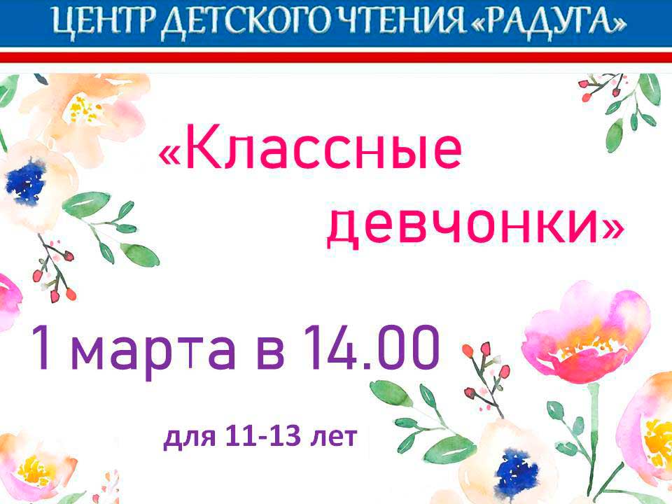 ![]() В воскресенье 1 марта в 14.00 приглашаем девчонок 11-13 лет в Центр детского чтения «Радуга» на игровую программу «Классные девчонки», посвященную 8 Марта. На встрече юные жительницы г.Невьянска примут участие в игровых и интеллектуальных конкурсах, проявят свои знани ... Читать дальше » |