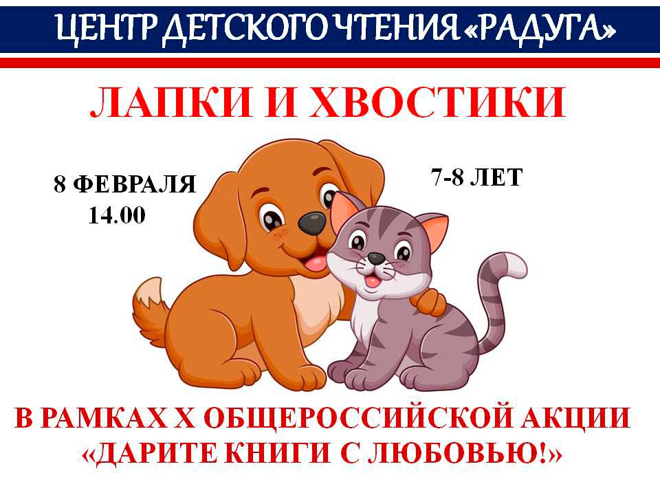 ![]() Центр детского чтения «Радуга» 8 февраля (воскресенье) в 14.00 приглашает активных читателей на познавательную программу «Лапки и хвостики» в возрасте 7-8 лет. Участники познакомятся с интересными фактами из жизни собак и кошек, примут участие в викторине по сказкам и ... Читать дальше » |