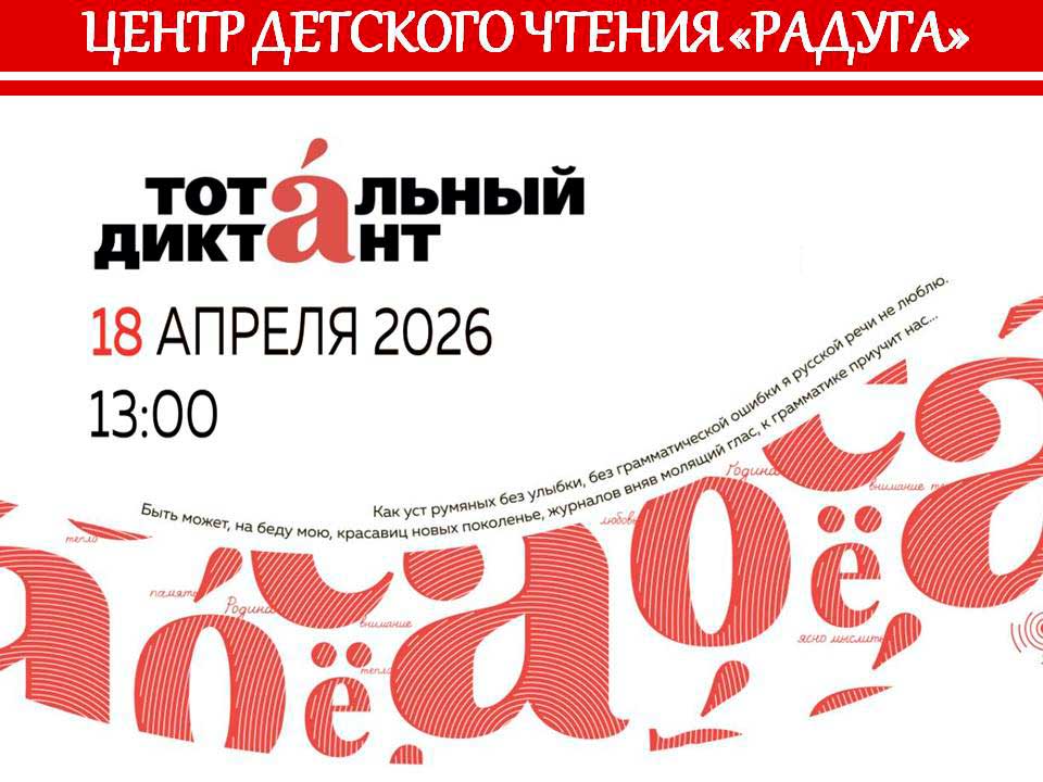 ![]() В 2026 году Международная акция «Тотальный диктант» пройдет уже в 23 раз! 18 апреля в 13.00 проверить свои знания в области русского языка жители смогут в Центре детского чтени ... Читать дальше » |